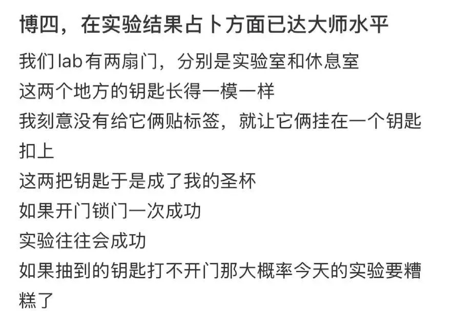 在本质室待真切,科学家也可能会运行服气“玄学”。独特是那些为数据发愁的商议生,要是本质老是作念不出来,或者是师兄学姐的本质无法重迭,他们的画风就会变得奇怪起来。